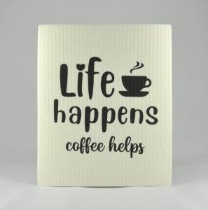 Vit disktrasa med svart tryck: Life happens Coffee helps