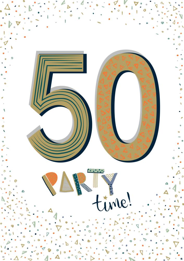 Vitt dubbelt kort med festligt print: 50 Party time! i olika färger och mönster. Små confetti inramar hela kortet.