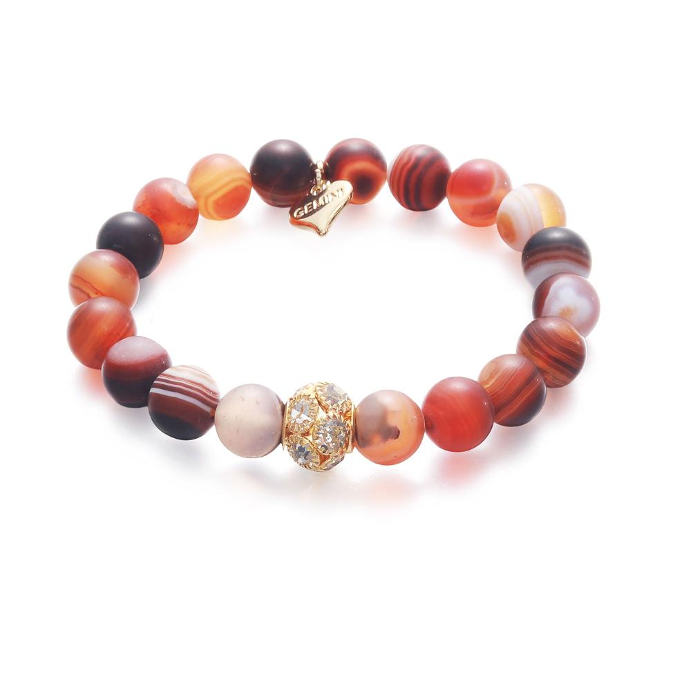 Ett armband som sticker ut. Olikfärgade pärlor i varma toner, med en guldfärgad strassprydd kula samt ett guldfärgat hjärta med leverantörens namn: Gemini.