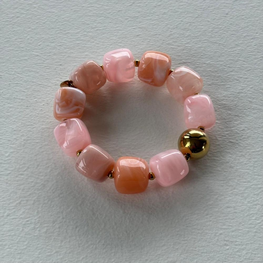 Härligt armband med mjukt fyrkantiga stenar i melerade rosa och orange toner, samt guldfärgade detaljer.