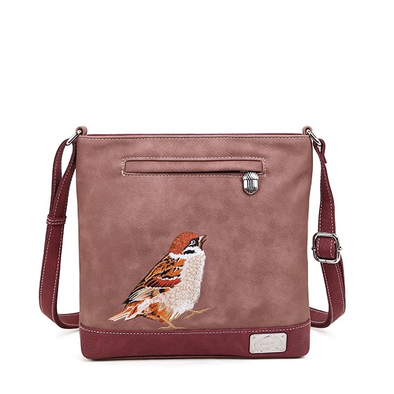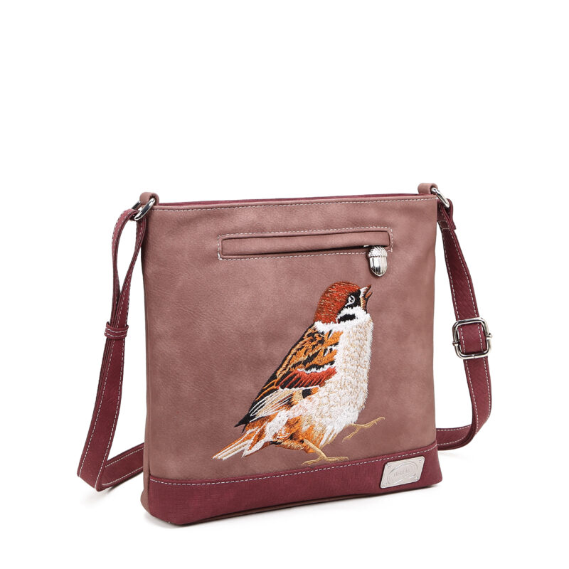Axelremsväska i veganskt läder med en broderad sparv. Flera bra fack, tex får mobiltelefonen plats i framfickan och nycklar i bakfickan. Och fortfarande har du mer plats till alla andra prylar...