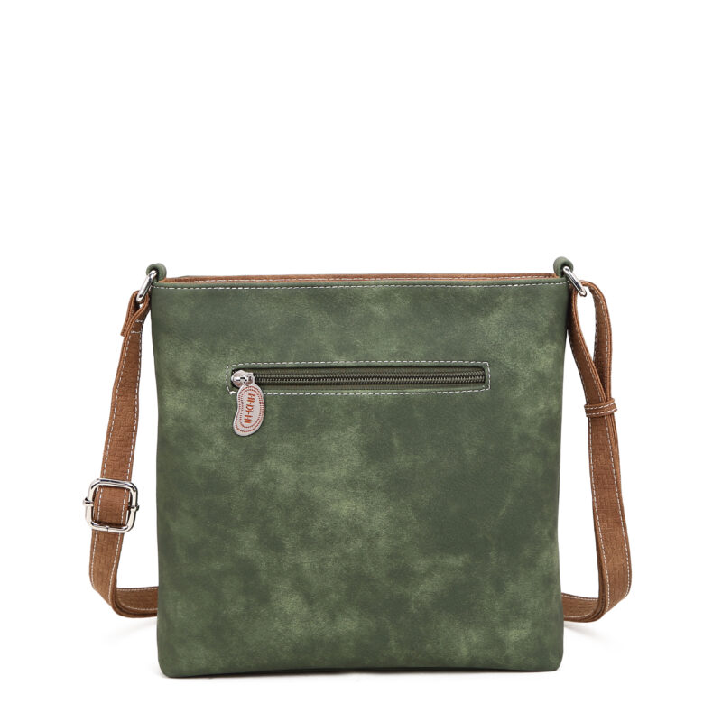 Denna axelremsväska från HI-DI-HI kombinerar smart funktion med charmig design. Den broderade sparven framtill ger väskan ett personligt och levande uttryck, medan färgkombinationen i grönt och brunt skapar en mjuk och naturnära känsla.