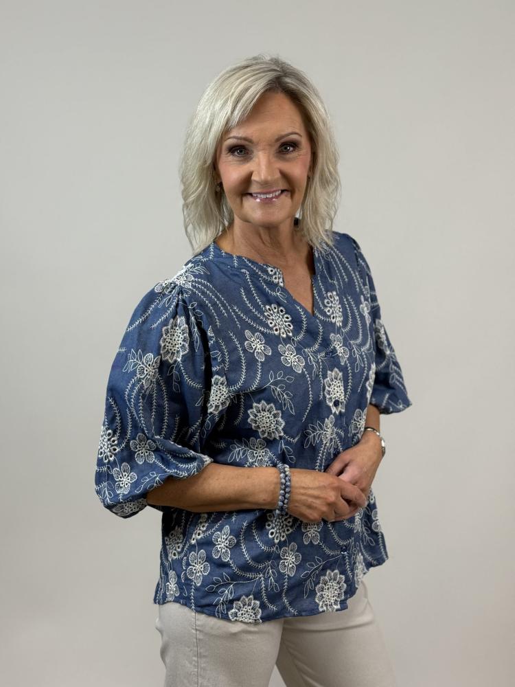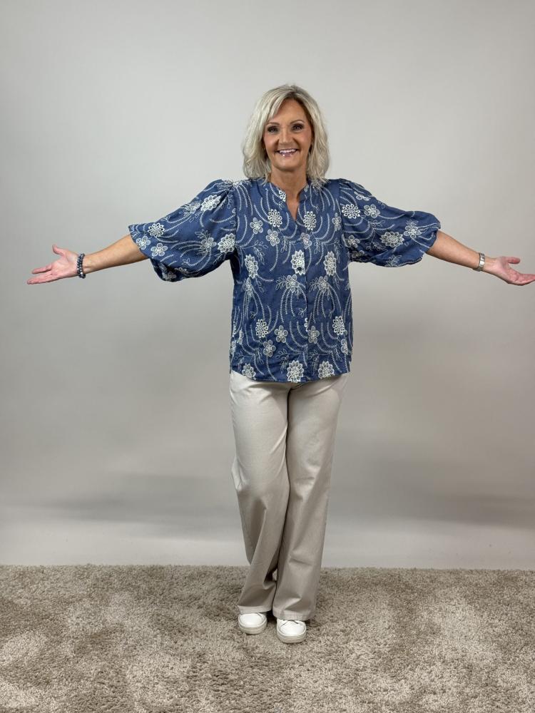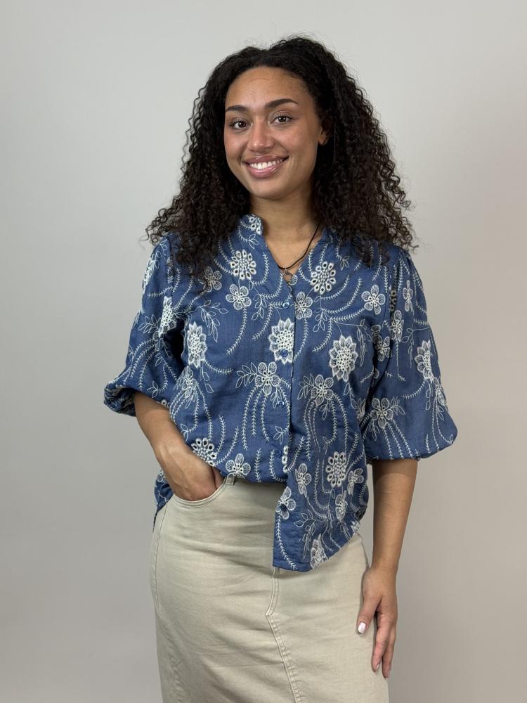 De dekorativa blomsterbroderierna ger en fin struktur i tyget och gör att blusen känns både klassisk och modern. Den passar lika fint till jeans för en vardaglig stil som till kjol eller byxor när du vill klä upp din outfit.