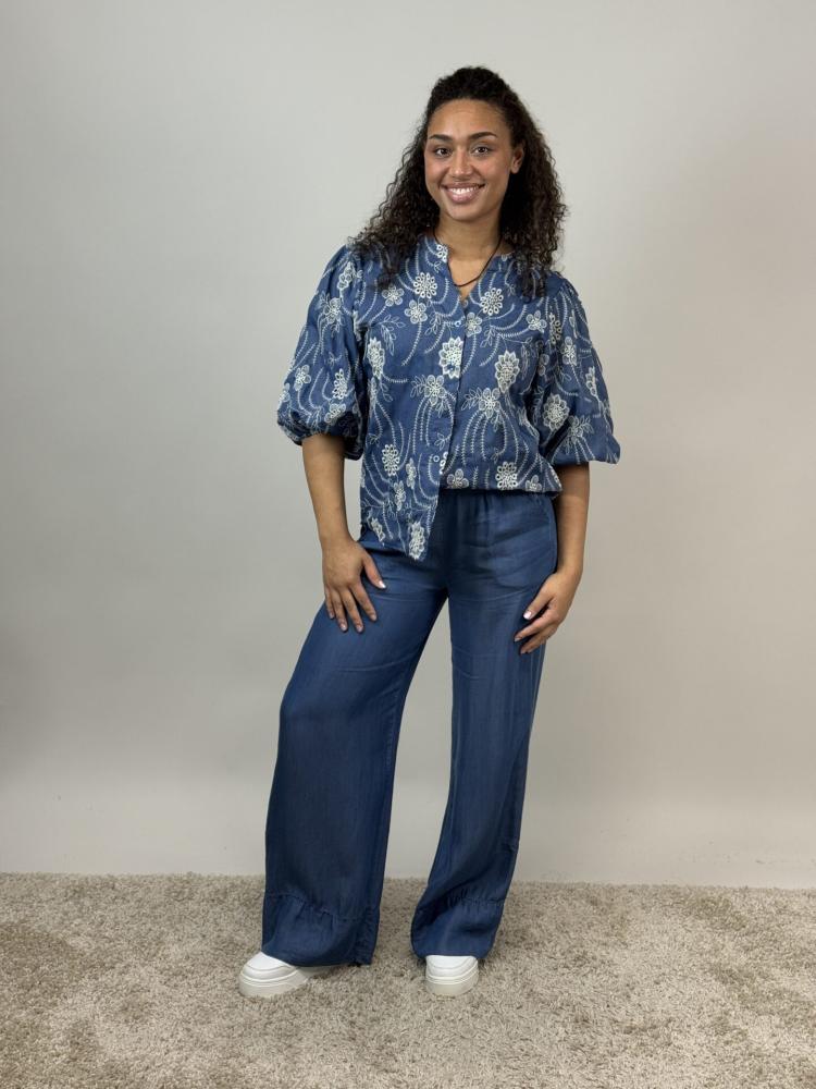 Härlig blå blus i bomullsmix, med puffärm som går ner till armbågen samt resår i ärmslutet vilket gör att du kan "puffa" upp ärmen lite. Fint broderier av blommor i en ljusbeige ton.
