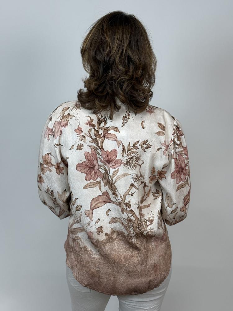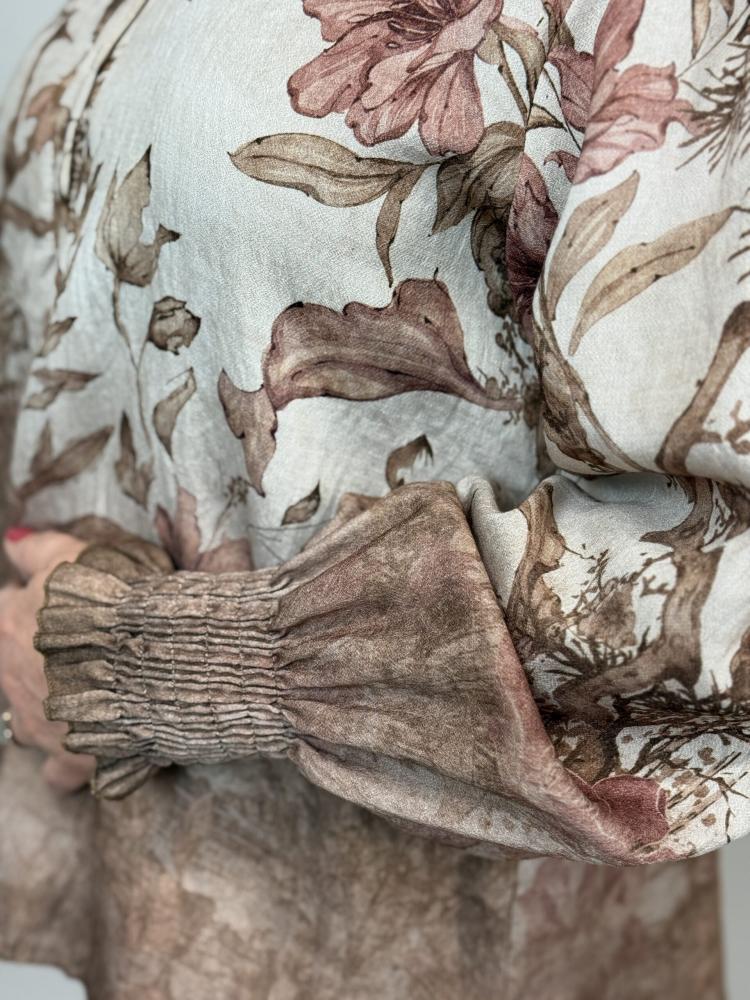 Blommig v-ringad viskoseblus med blommigt print i jordnära toner på beige botten. Knappar fram i halsen och bred resår smock i ärmslut.