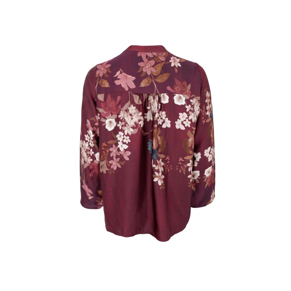 Vacker blus i satin med en lite lyxig känsla. V-ringad med lång ärm samt resår i ärmslut. Blommor i brunt, petrol, sand mm
