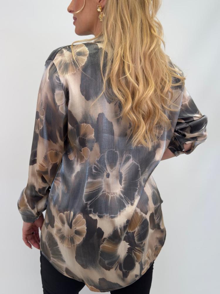 Blommig blus i svart, sand mm. Genomknäppt, utan krage och med manchett i ärmslut. Blusen ger en lyxig känsla med lite lyster i tyget.