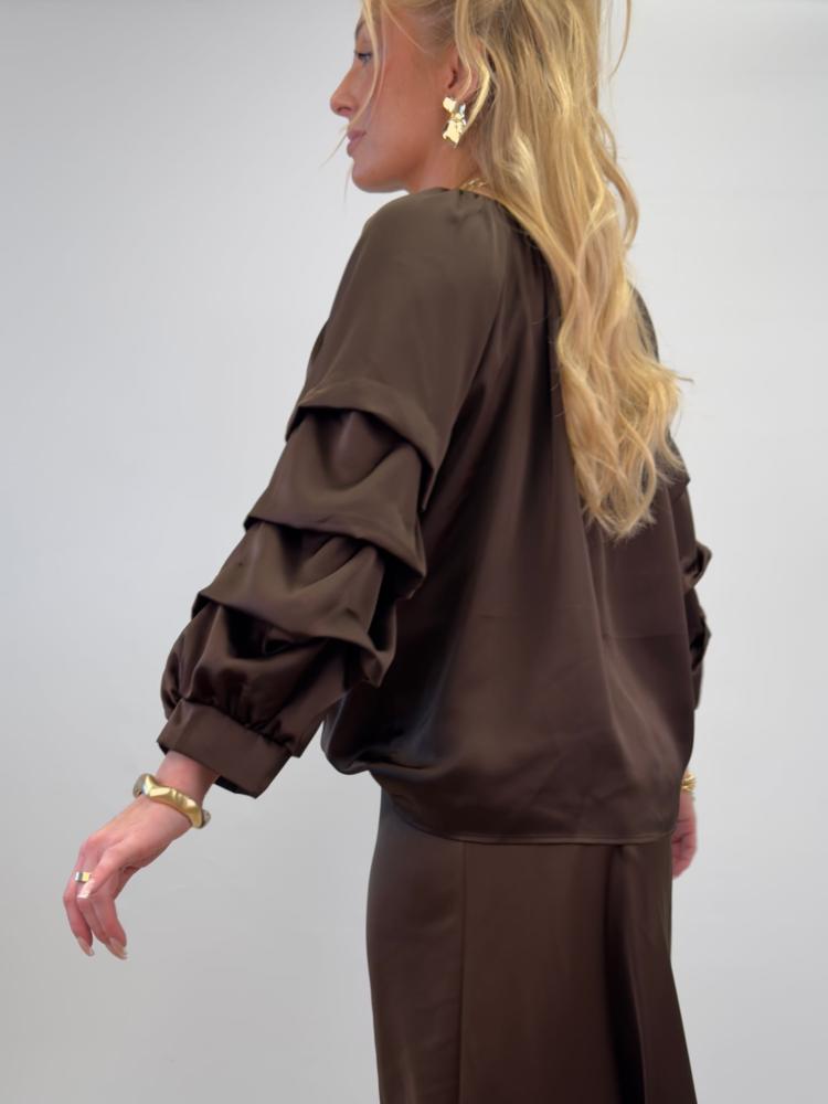 Brun blus i ett glansigt material som ger en lite lyxig känsla. De lekfulla ärmarna lyfter hela outfiten.