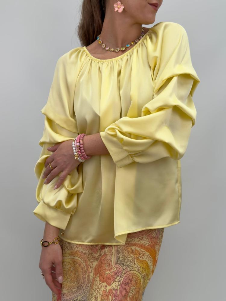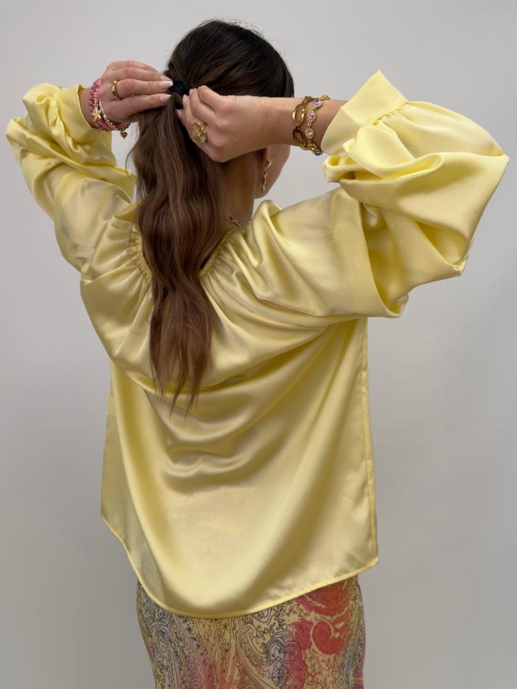 Gul blus i ett glansigt material som ger en lite lyxig känsla. De lekfulla ärmarna lyfter hela outfiten.