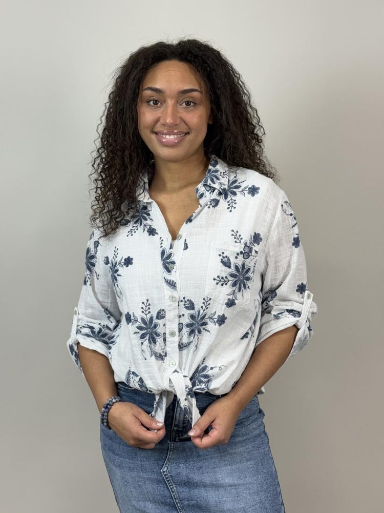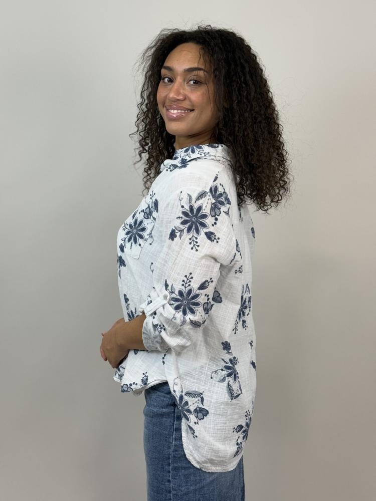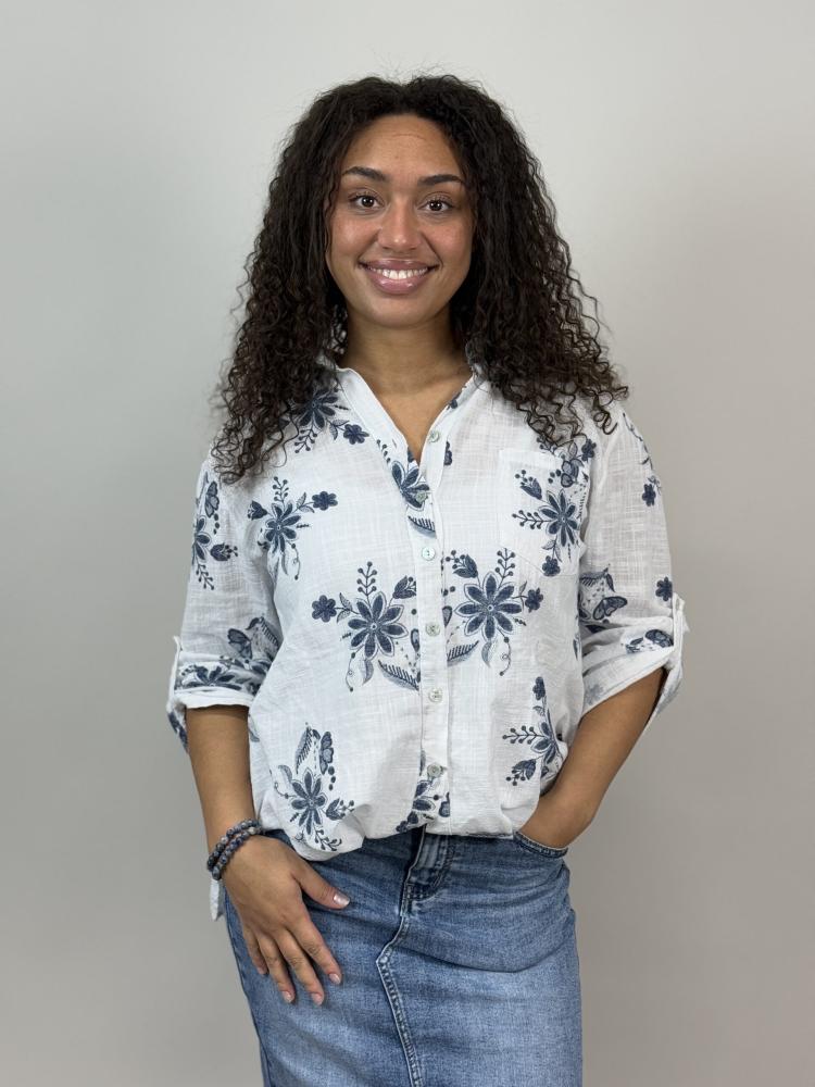 Vit blus med mönster av blommor och blad, krage och knappar hela vägen. Bröstficka och knappslå på ärmen. Vit botten med blommöster i mörkblått. Tryckt print men ser nästan broderat ut.