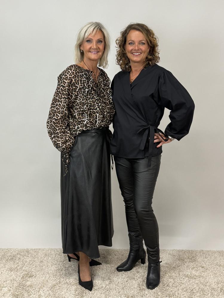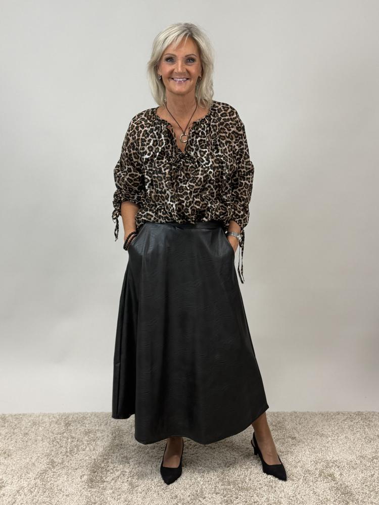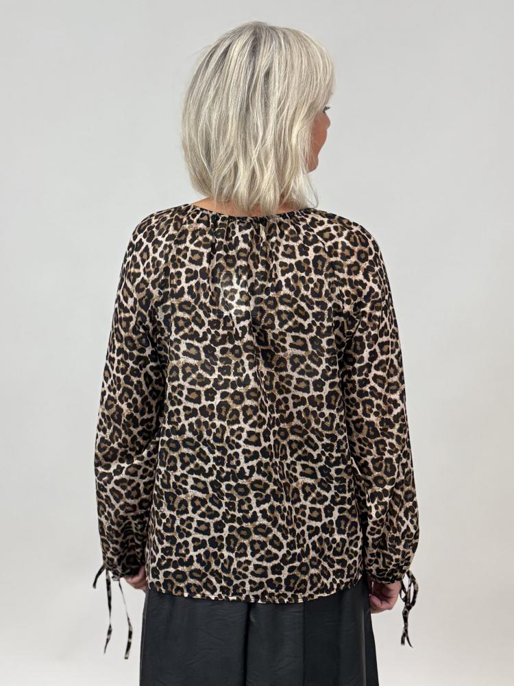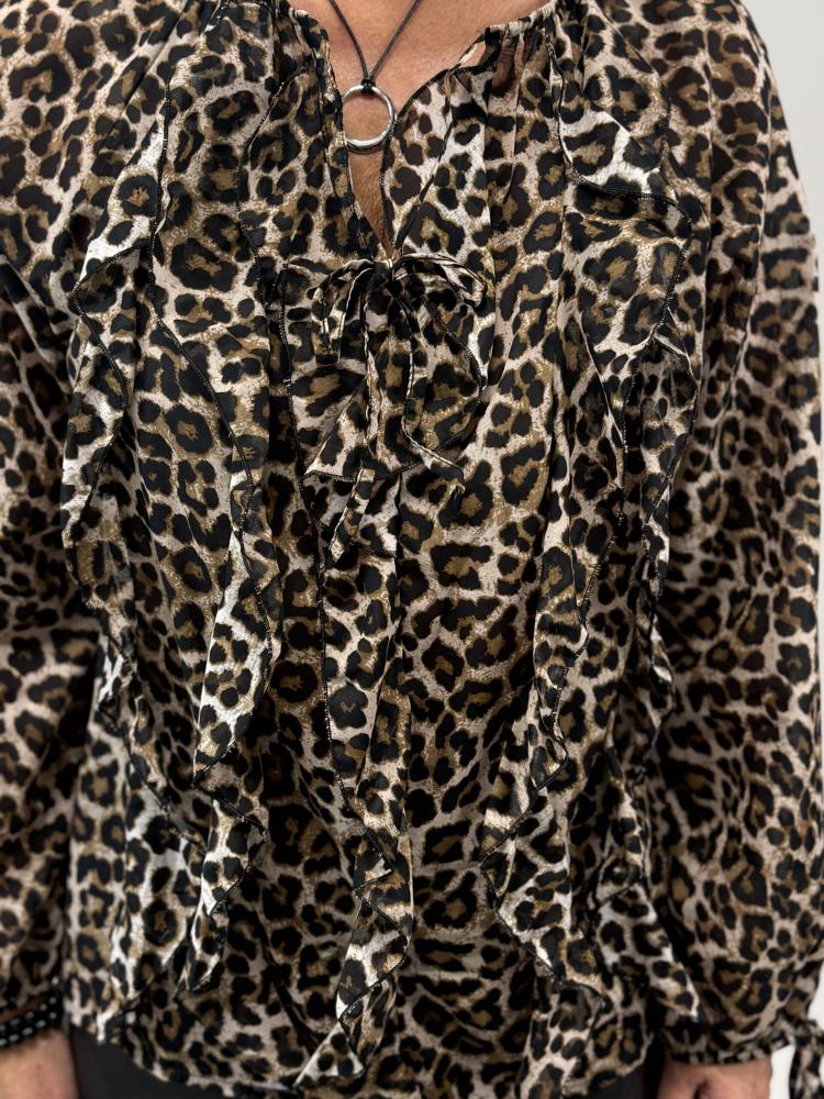 Marcella – leomönstrad blus med volanger och knytband