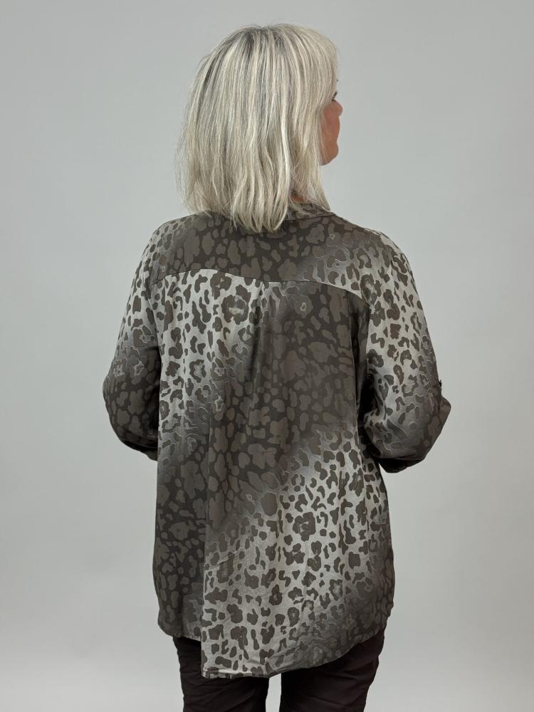 Marina är en stilfull blus i mjuk viskos med ett diskret leomönster som ger en modern och trendig känsla. Den v-ringade halsen utan krage och knappslån framtill gör den både elegant och lättburen. En bröstficka ger ett avslappnat intryck – perfekt att bära både till vardagsjeans och under en kavaj.