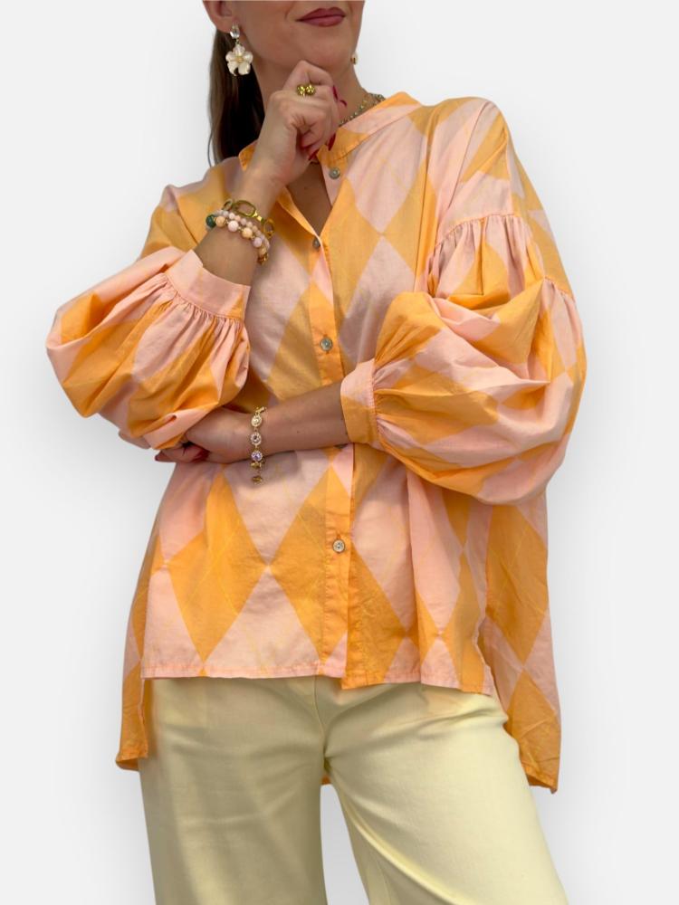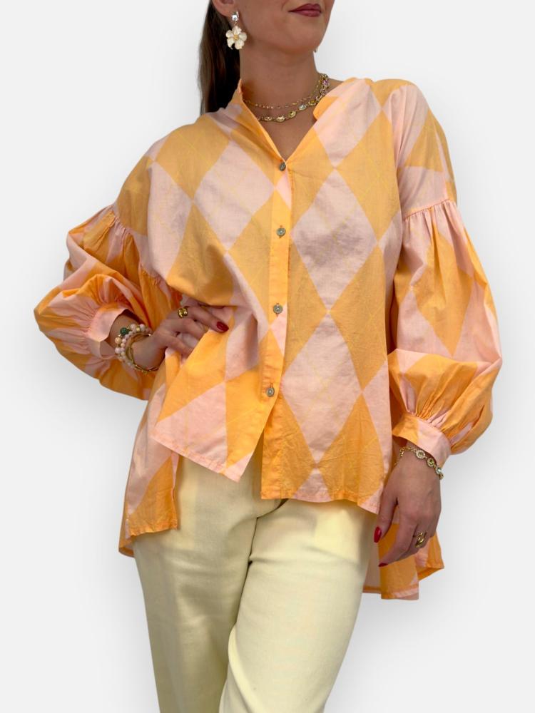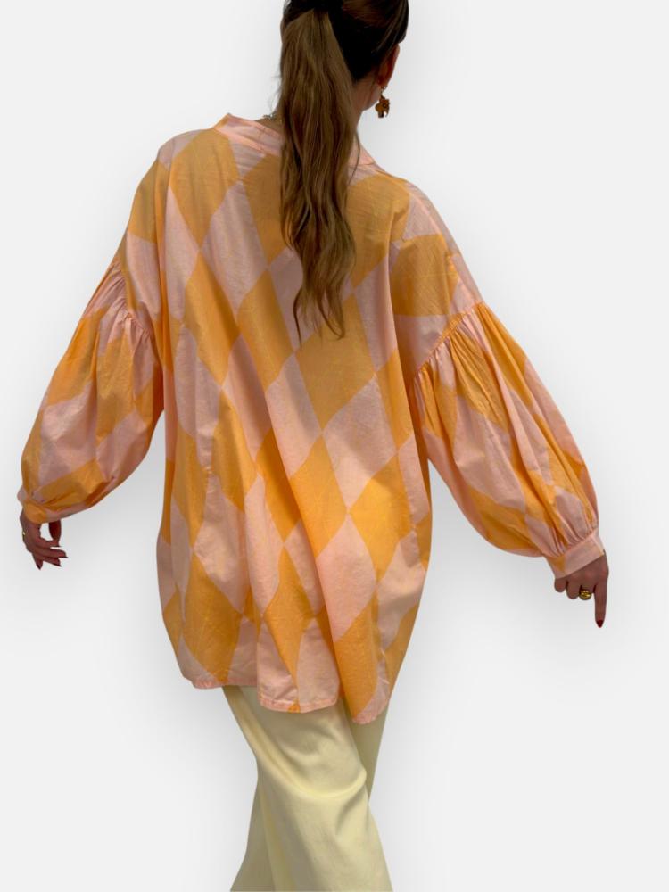 En festlig harlekin rutig blus i bomull; rutor i rosa och orange. Helknäppt utan krage och med en lång ballongärm som avslutas med manschett och knapp.