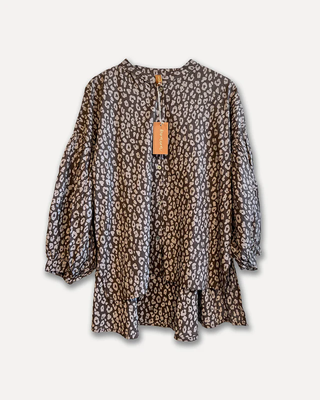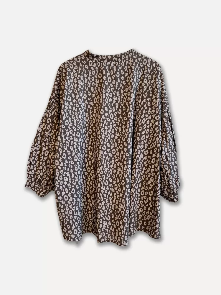 Mjuk och härlig mörkt brun blus med smått leoprint i taupe - i tunn och skön bomull. Ballongärm och bra rymlig i passformen.