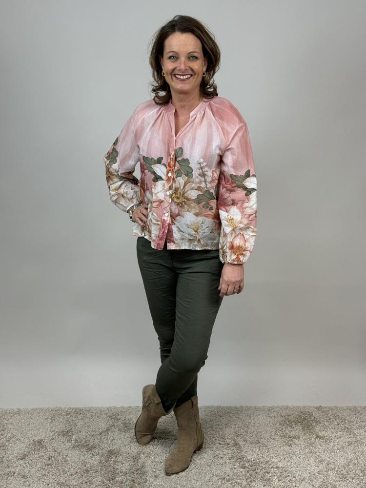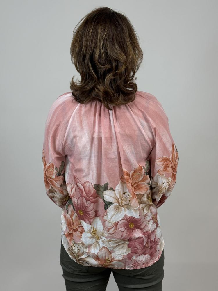 V-halsad rosa blus i lite transparent bomull. Helknäppt fram, samt lång ärm med resår i ärmslut. Vacker blombård nertill samt i ärmslut.