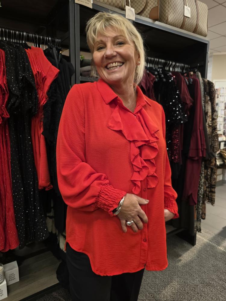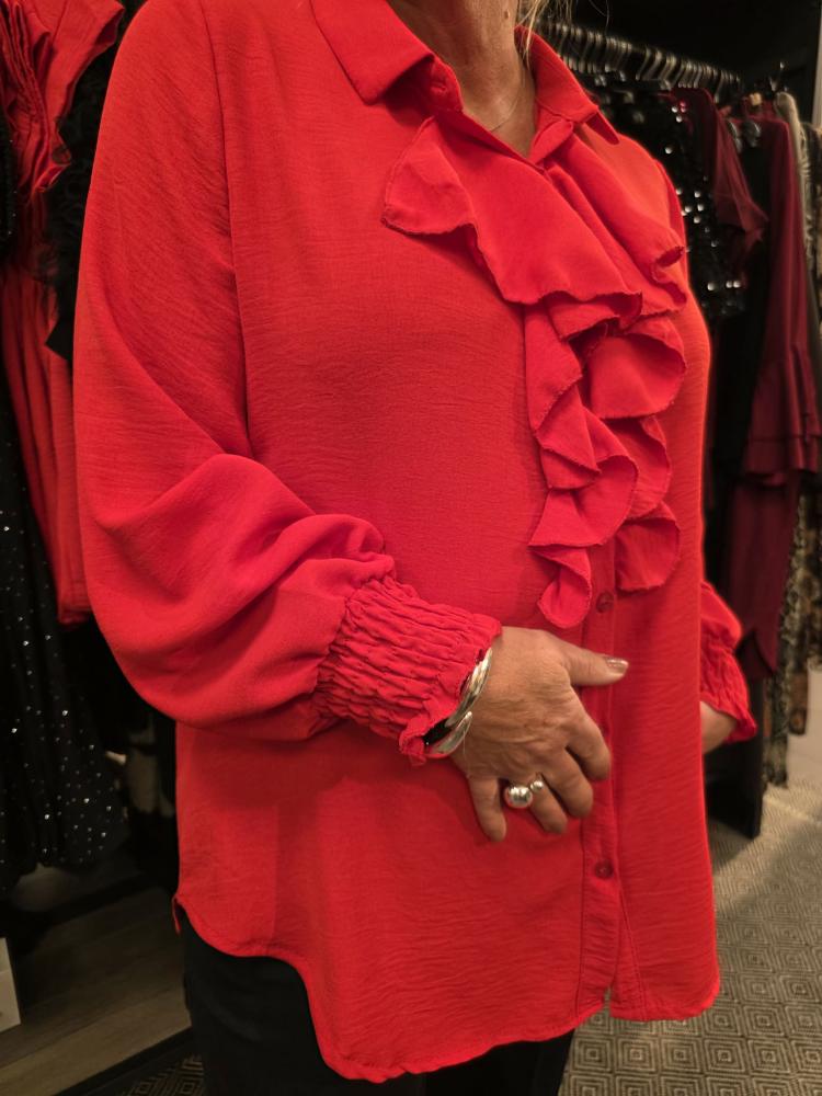 Fin röd helknäppt blus med volang fram samt lång ärm med smock i ärmslut.