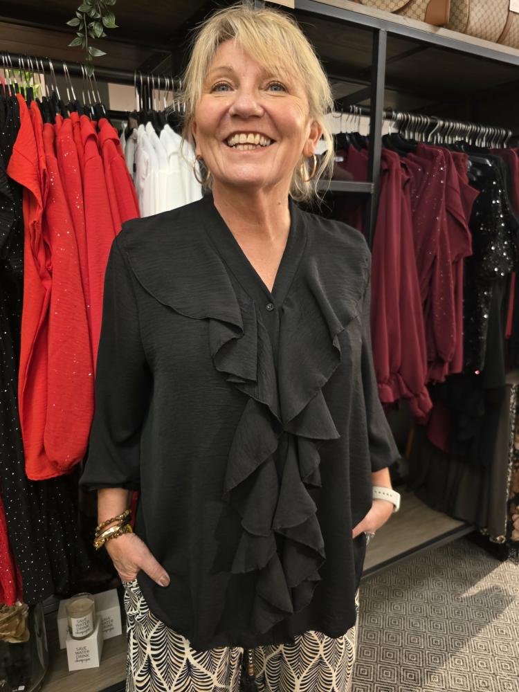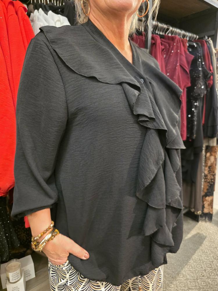 Fräsch och snygg svart blus med volang och lång ärm med resår och volang nertill. Lös och ledig modell som passar många. Klä upp till fest, med en glittrig kjol eller vaxad byxa - klä "ner" med jeans och en snygg boots till.