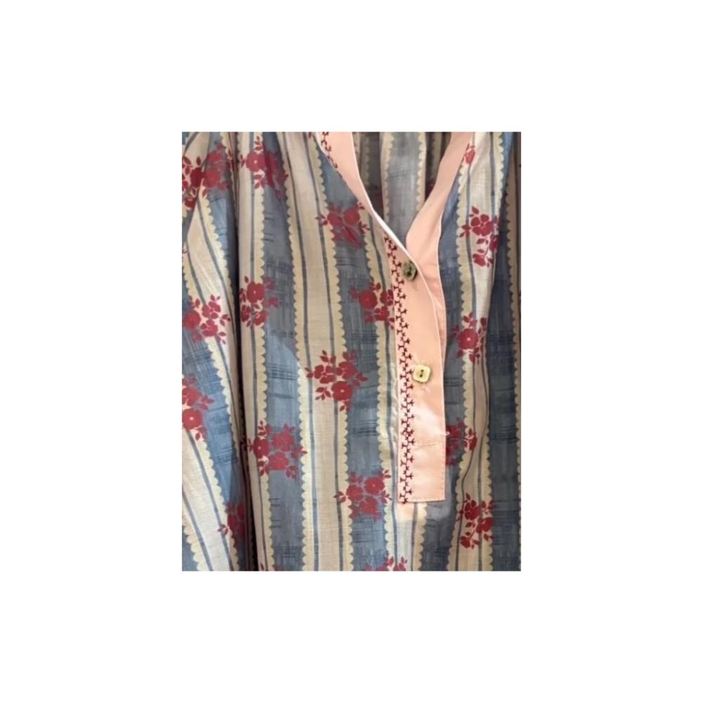 Fin och lite annorlunda blus med vackra detaljer. Randig i blått och vitt, med rosa blommor samt ljusrosa knappslå i halsen och i ärmslut. Skön och härlig vidd i ärmarna.