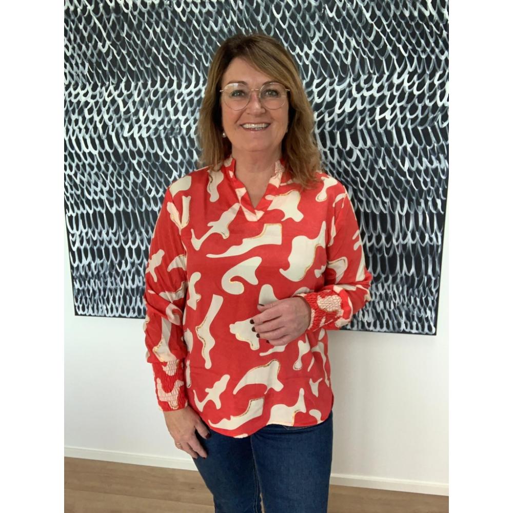 Ella är en lätt och festlig blus med en stilren V-ringning och en smickrande silhuett. Det tunna, något glansiga materialet ger en elegant känsla, perfekt för både vardag och festliga tillfällen. De långa ärmarna avslutas med en bred smock, vilket gör att du enkelt kan anpassa ärmlängden efter önskemål.