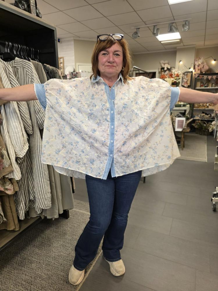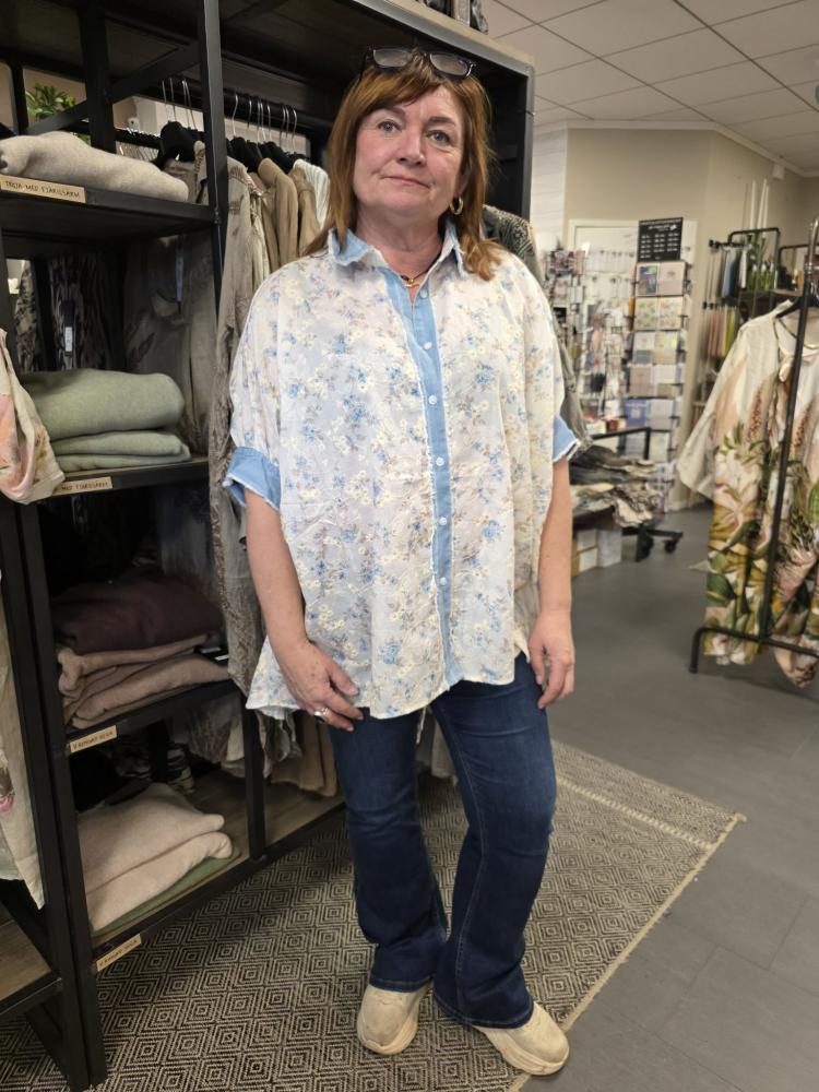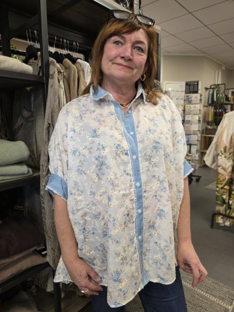 Här har vi en blus utöver det vanliga, i skir spets med detaljer i ljus denim - Dubbelstorlek