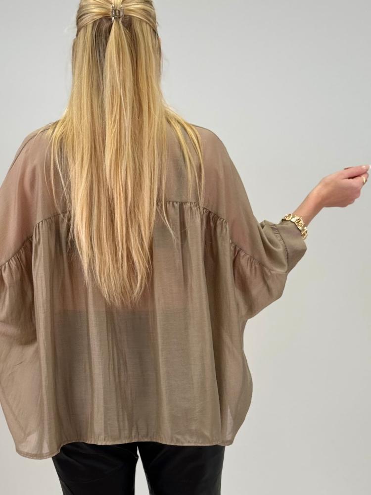 Taupefärgad blus i ett material som ger en lite lyxig känsla. De lekfulla ärmarna lyfter hela outfiten. Enkel att dressa både upp och ner - beroende på tillfälle.