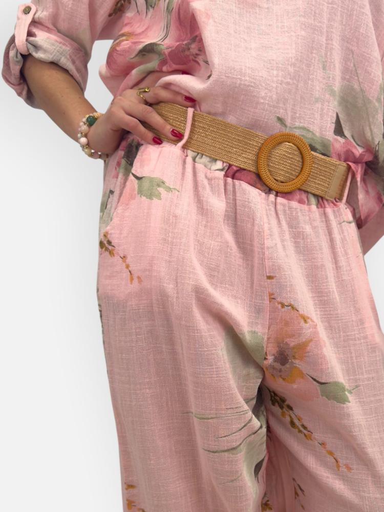 Rosa bomullstopp med vackra blommor i rosa nyanser. Rund hals samt slejf på armen, så du kan korta den. En somrig och fin blus i en luftig och bekväm modell.