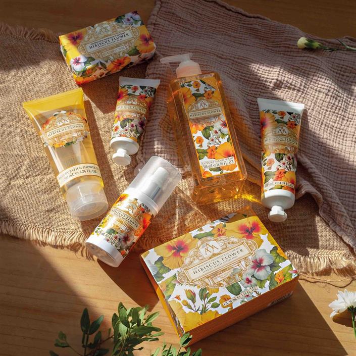 Hibiscus Flower doftpyramid: Top notes: Green, orange, lemon, cyclamen. Heart notes: Pinapple, lilly, jasmine, violet. Base notes: Raspberry, peach, musk, caramel.
