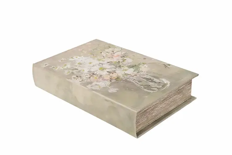 Beige melerad bok med motiv av en bukett blommor i en vas. Dekorativ att ha liggande i ex hallen - för uppsamling av sådana prylar man inte vill ha liggande framme; nycklar, mynt, lypsyl, pennor, fjärrkontroller osv osv