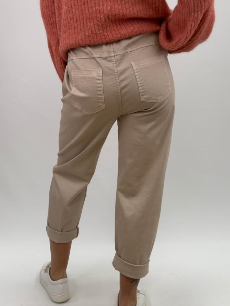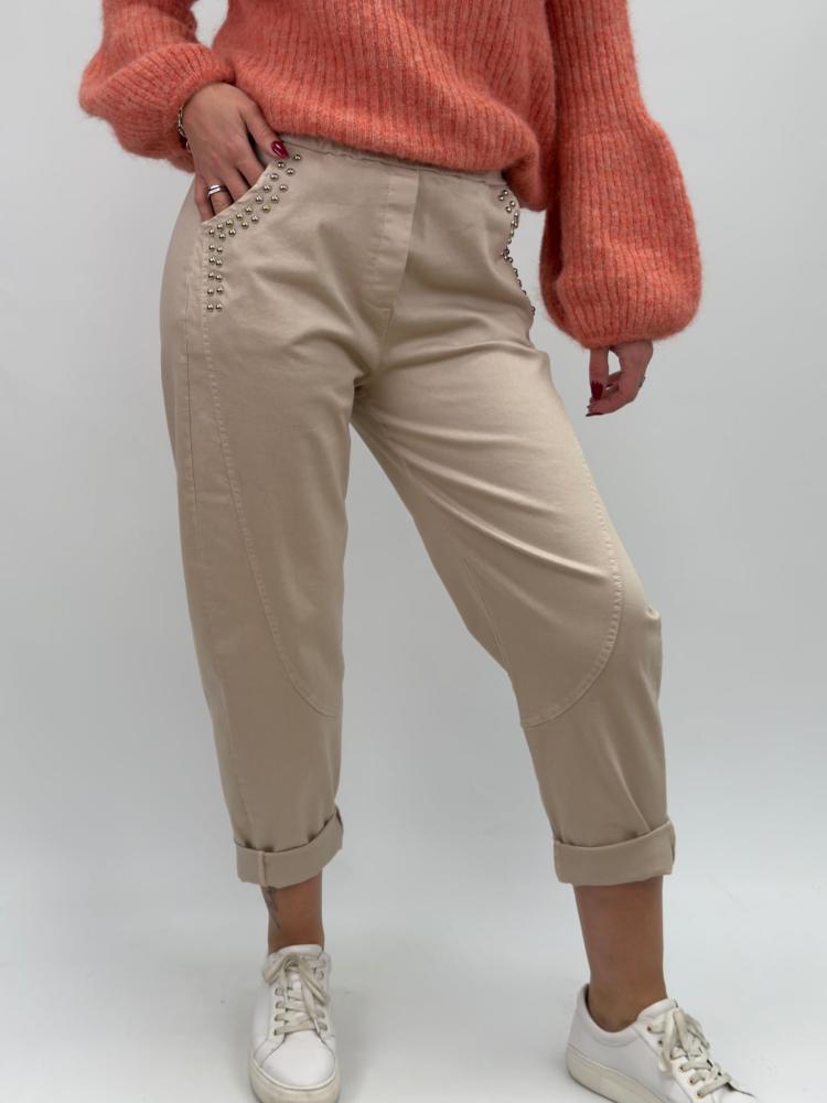 Bekväm beige byxa med en avslappnad passform och dekorativa nitar. De uppvikta bensluten och den mjuka midjan gör dom både bekväma och snygga. I bomull med lite stretch för extra skön komfort.