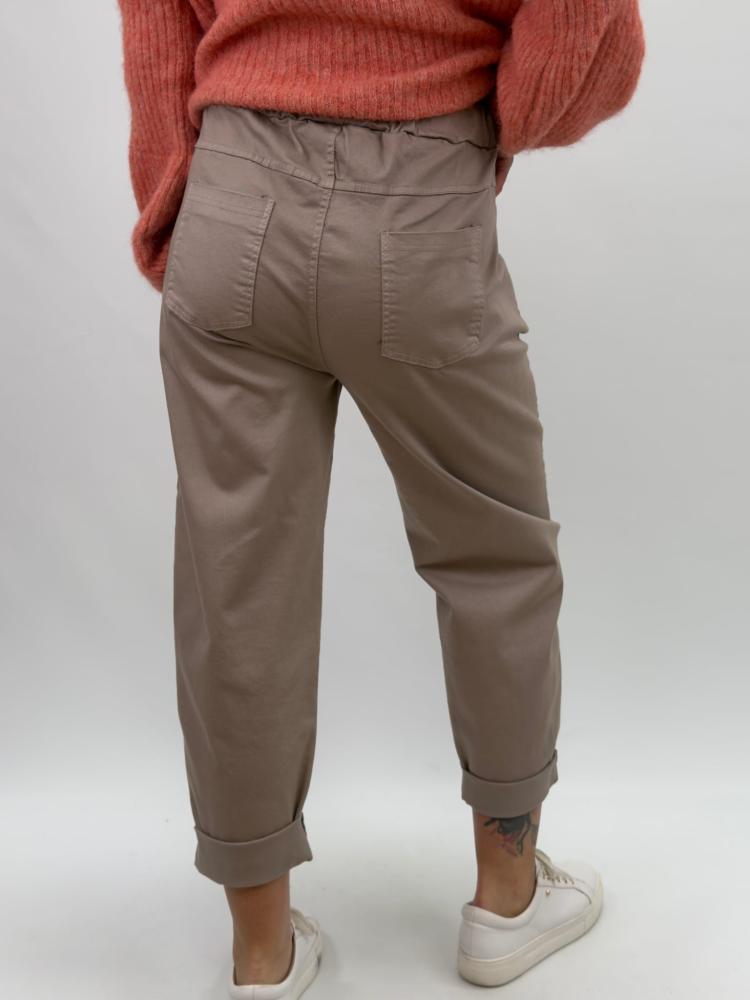 Bekväm taupefärgad byxa med en avslappnad passform och dekorativa nitar. De uppvikta bensluten och den mjuka midjan gör dom både bekväma och snygga. I bomull med lite stretch för extra skön komfort.