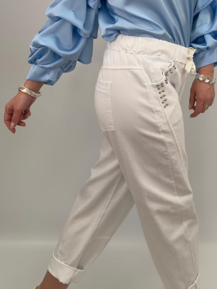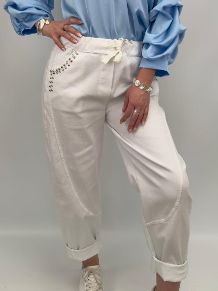 Bekväm fräsch vit byxa med en avslappnad passform och dekorativa nitar.