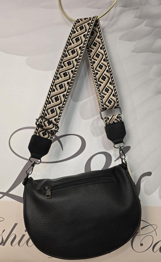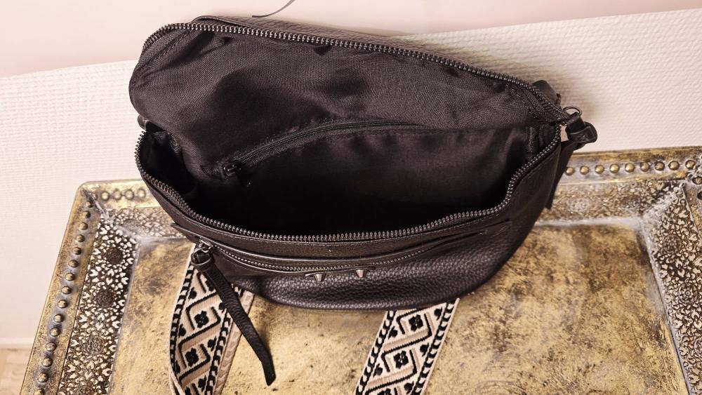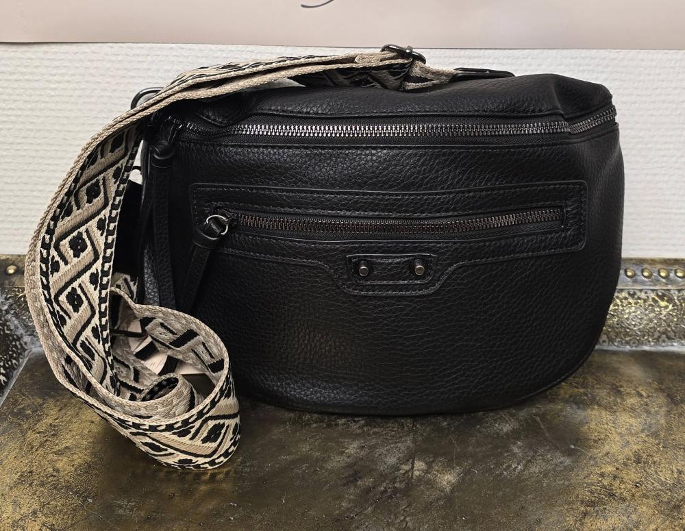 Svart väska med trevliga detaljer. Snygg att bära "cross over" - tack vare den fina justerbara axelremmen.