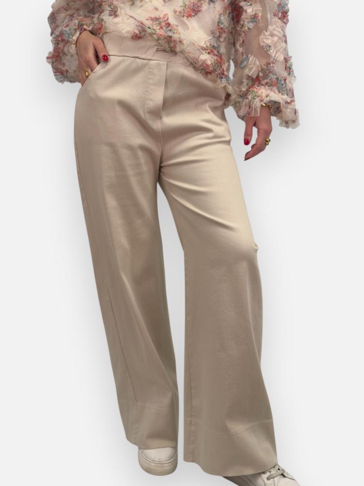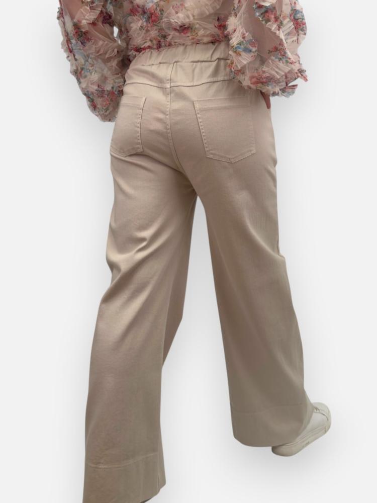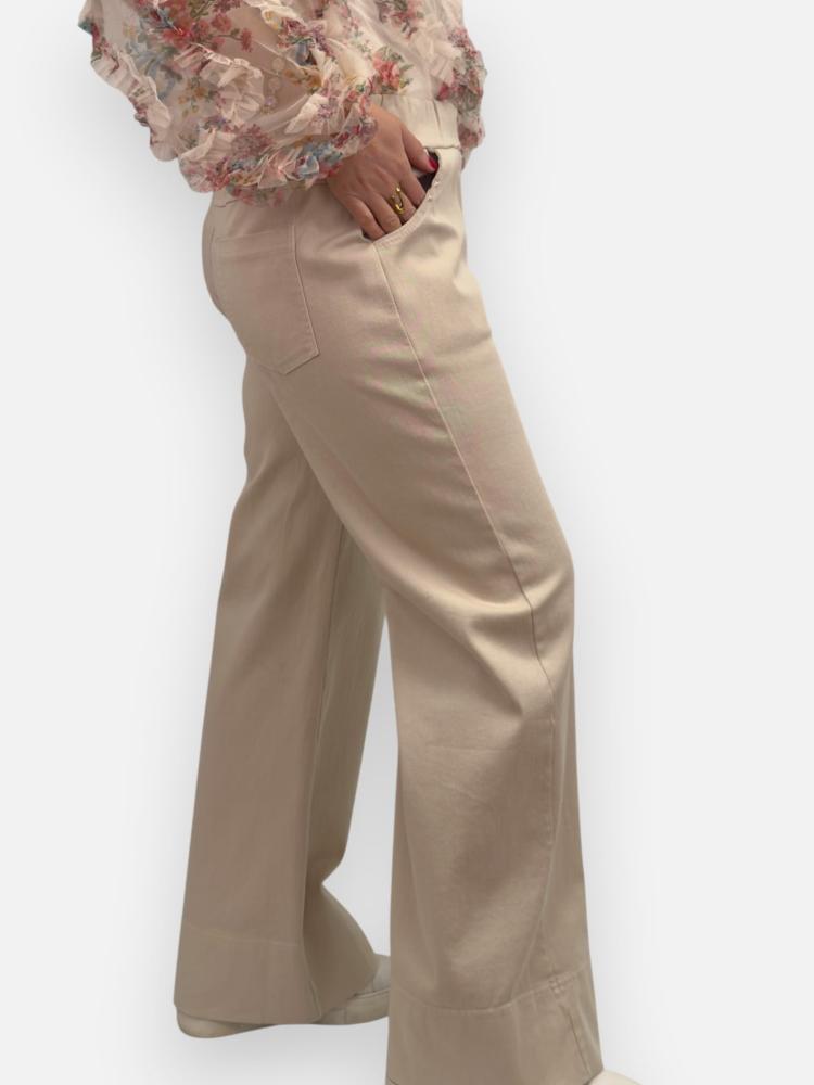 Beige byxa i bomull och en härlig stretch. Lite vidd i benen, som avslutas med ett brett upplägg nertill. Fickor fram och bak. Byxorna för både vardag - och fest!