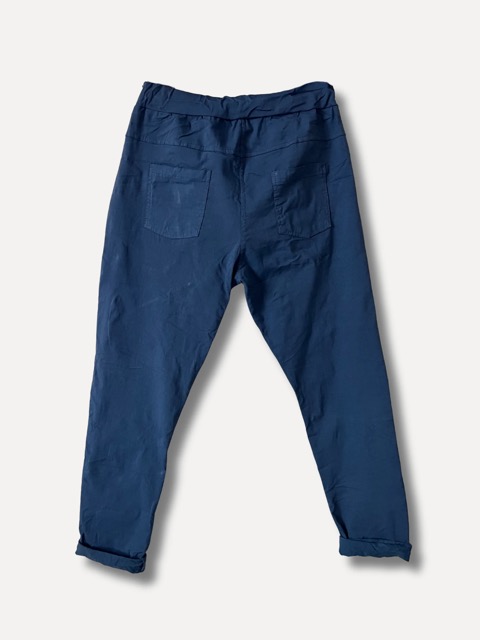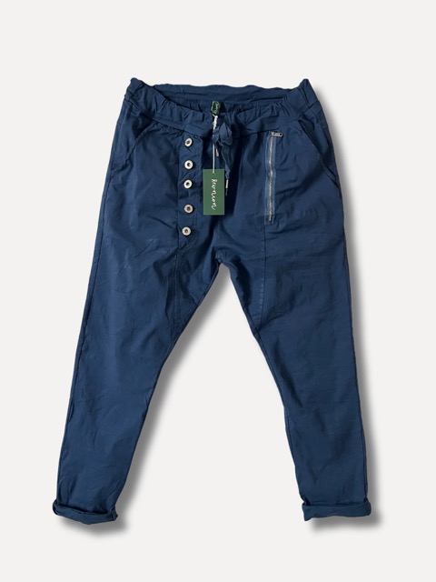 Skön och stretchig blå byxa med extra allt. Detaljer i form av knappar och dragkedja vid sidan. Fickor fram och bak.