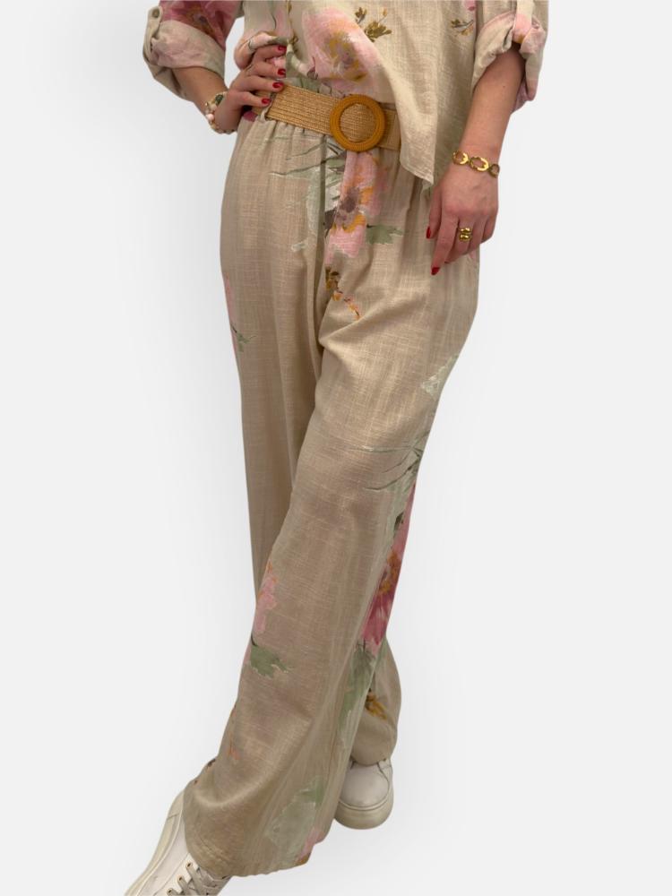Beige byxa med vackra blommor i rosa nyanser. Bred resår i midjan samt ett medföljande avtagbart bälte. Fickor i sidan. En luftig byxa med vida ben, vilka ger ett avslappnat fall. En byxa när du vill känna dig både bekväm - och lite chic.