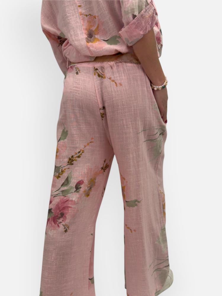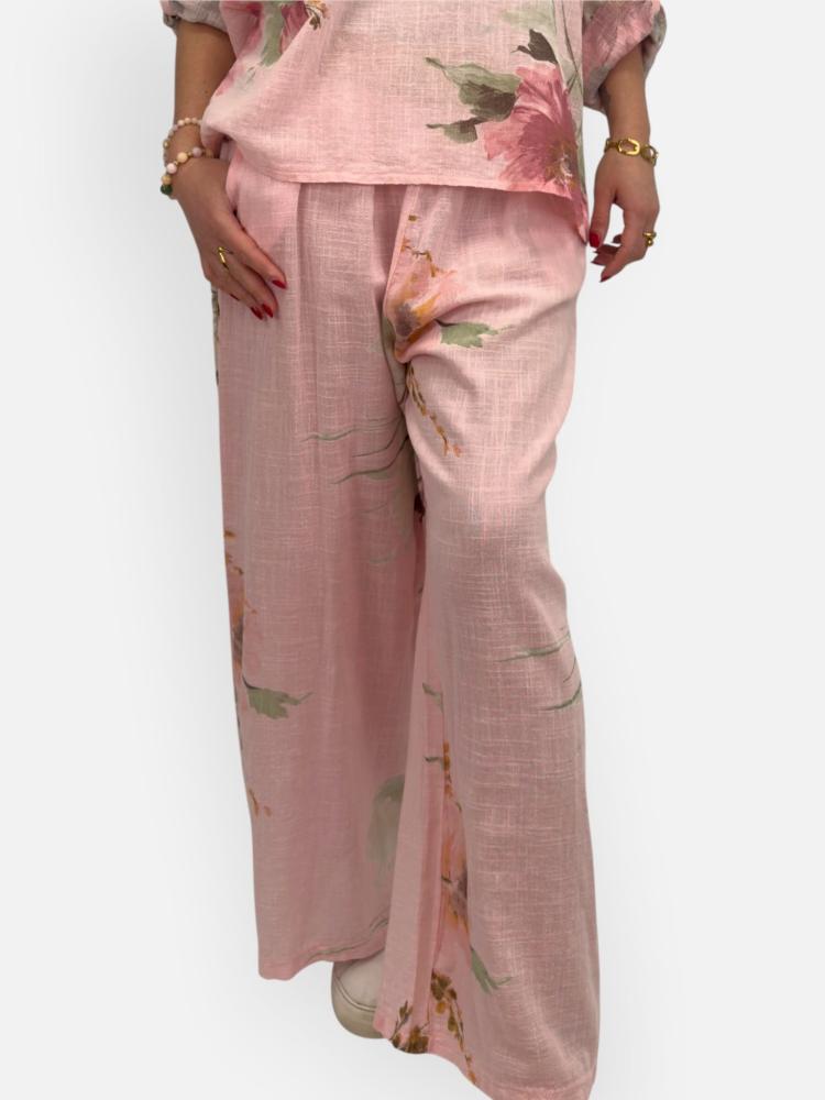 Rosa byxa med vackra blommor i rosa nyanser. Bred resår i midjan samt ett medföljande avtagbart bälte. Fickor i sidan. En luftig byxa med vida ben, vilka ger ett avslappnat fall. En byxa när du vill känna dig både bekväm - och lite chic.