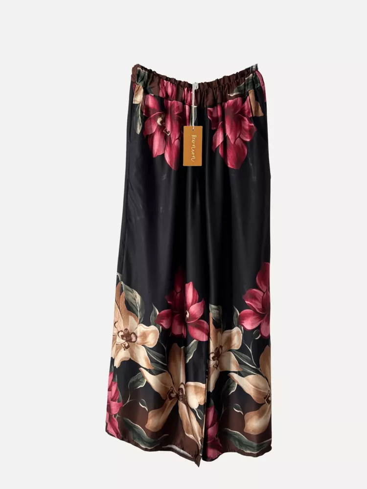 Vackra silkiga och lyxiga byxor med lite bredare resår i midjan och skön vidd i benen. Svart botten med blommor i vinrött, sand och brunt - samt gröna blad.