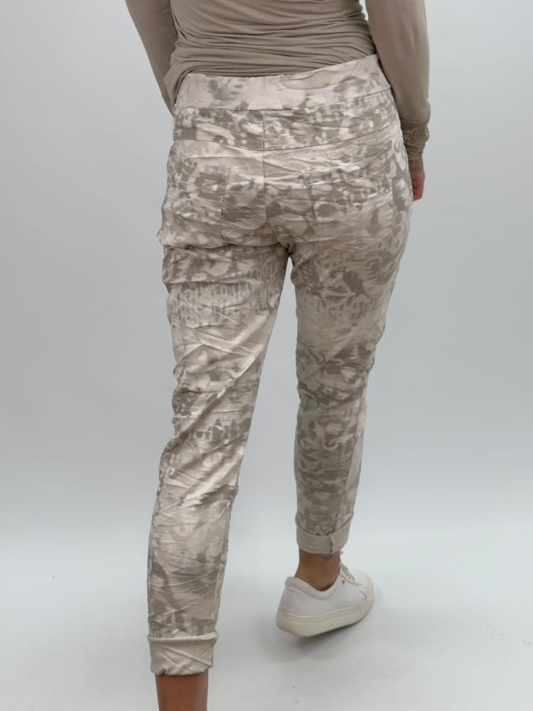 Mjuk, skön och stretchig byxa med resår i midjan samt knytband och fickor bram. Spräckligt mönster i harmonierande beige och taupefärgade toner.