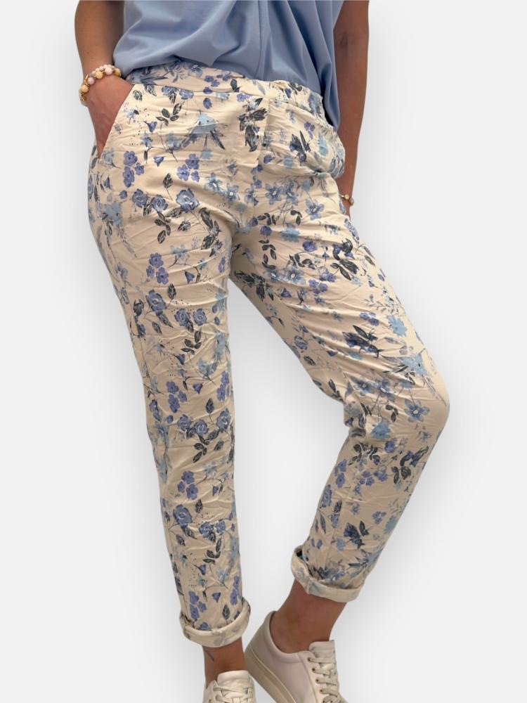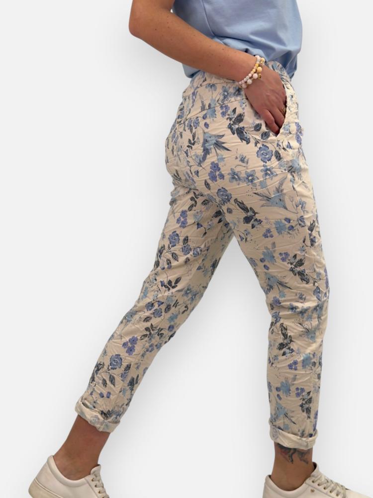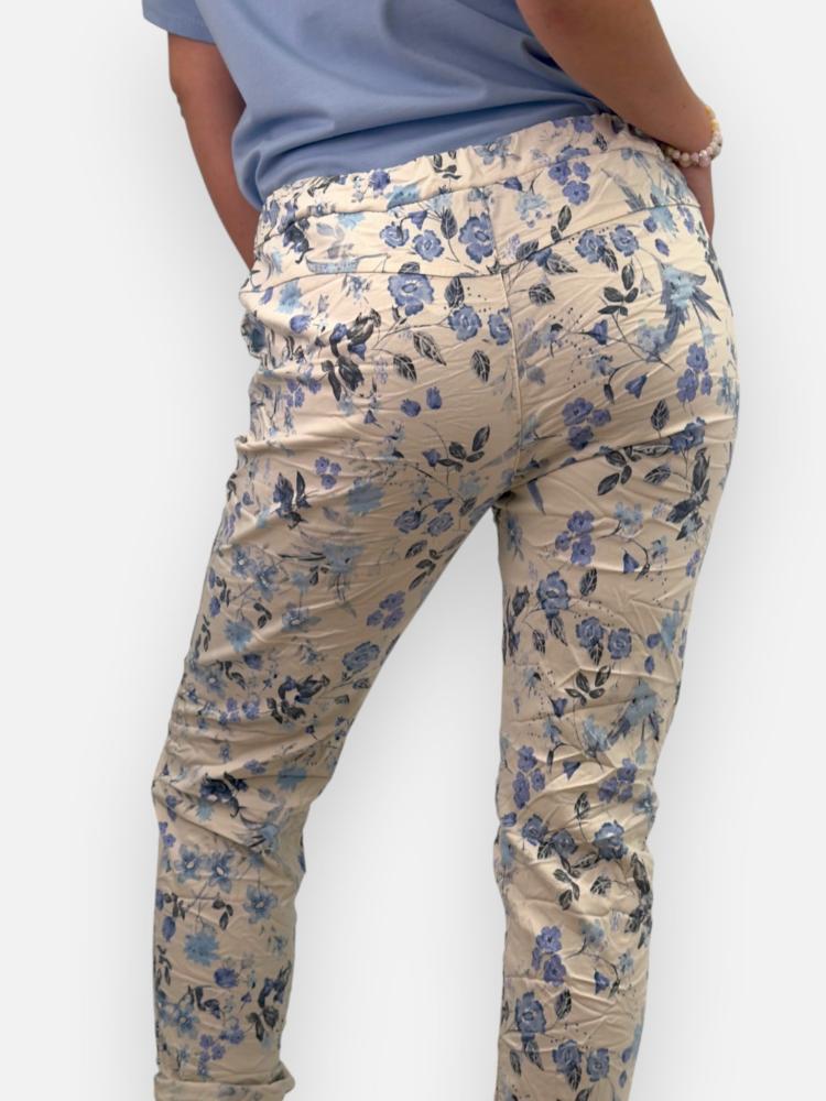 Mjuk, skön och stretchig byxa med resår i midjan samt knytband och fickor fram. Blå blommig på ljus botten.