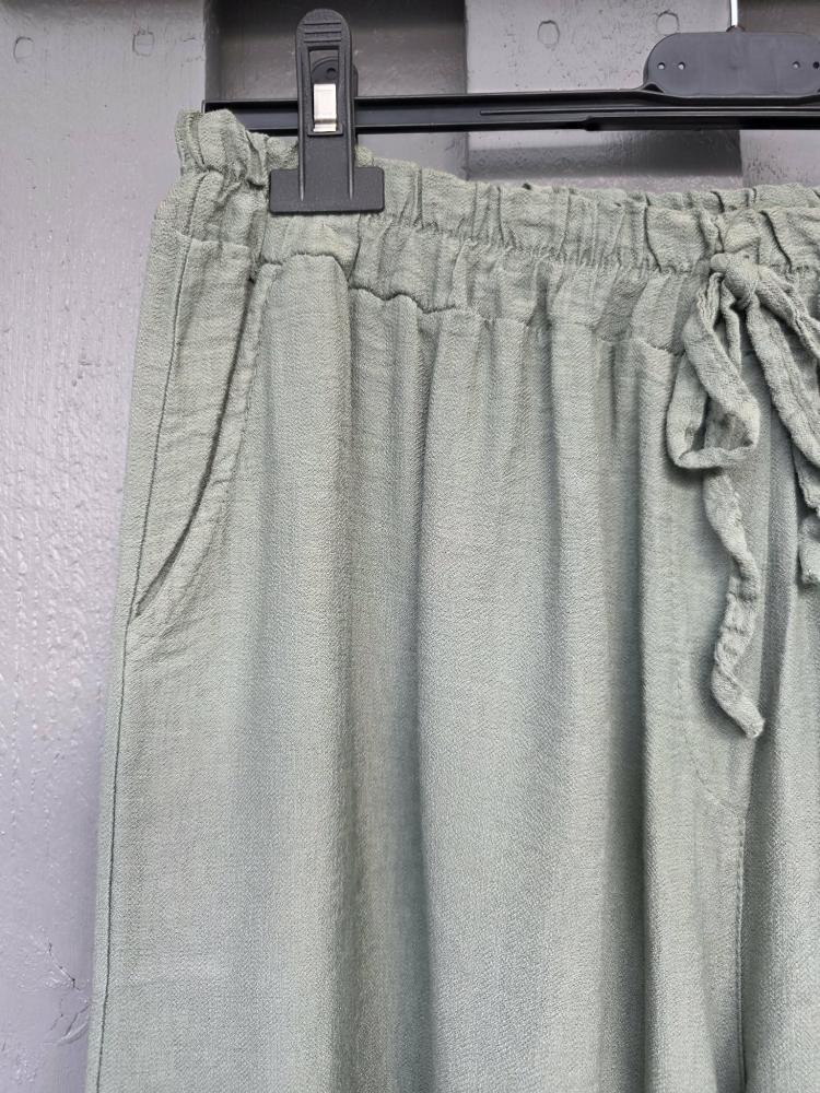 Härlig byxa i en army grön lite grövre viskoseblandning. Bred resår med knytband och fickor