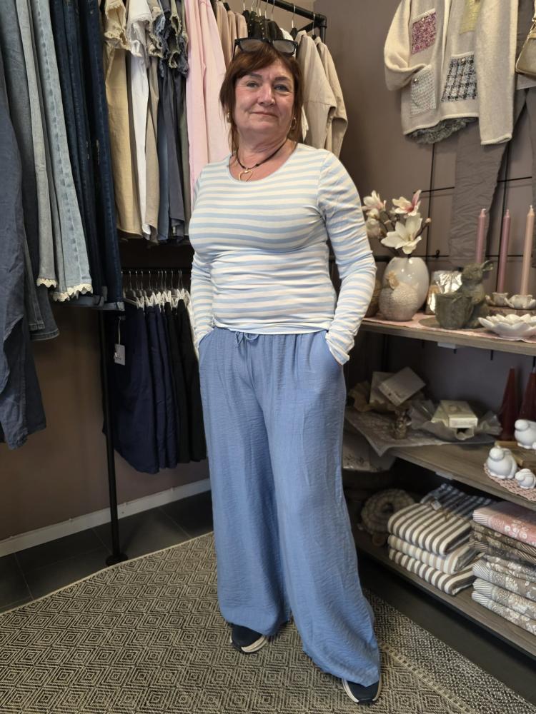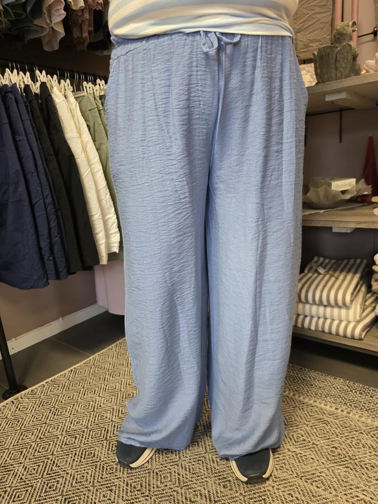 Härlig byxa i en blå lite grövre viskoseblandning. Bred resår med knytband och fickor
