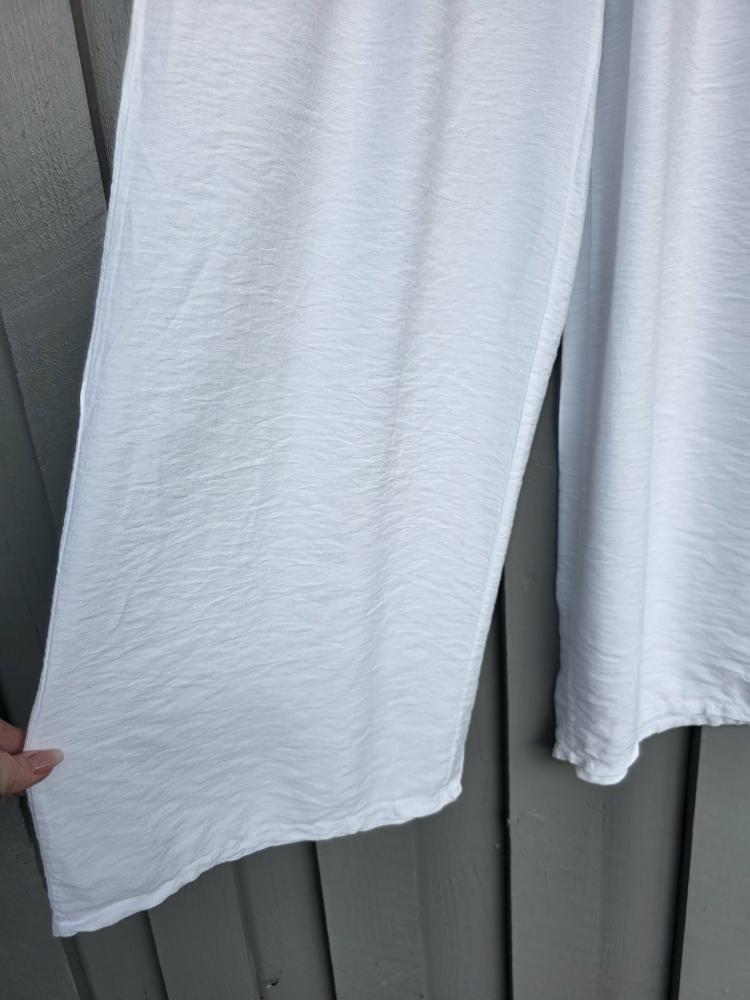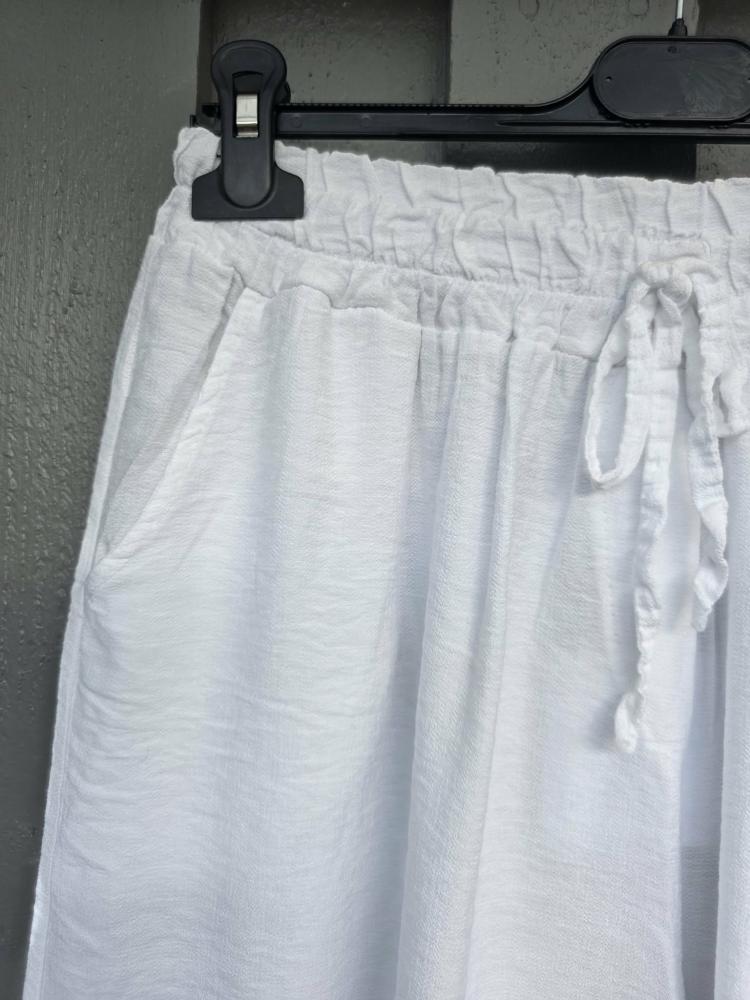 Härlig byxa i en fräsch vit lite grövre viskoseblandning. Bred resår med knytband och fickor