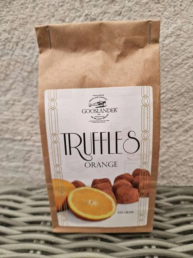 Lyxiga tryfflar med en hint av apelsin, förpackade i en trevlig papp-påse i brunt kraftpapper.