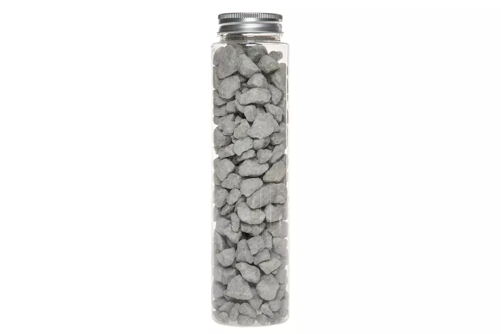En burk med grå småsten, som dekoration i ljusstakar, ljusfat osv