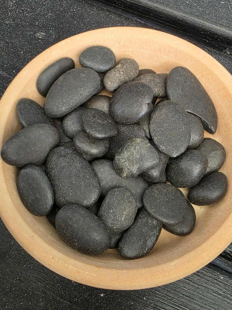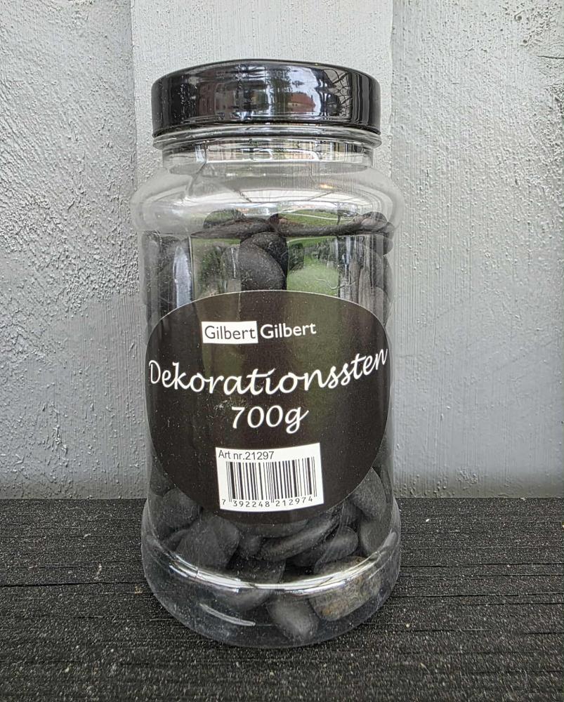 En burk med svarta platta och lena små stenar, som dekoration i ljusstakar, ljusfat osv