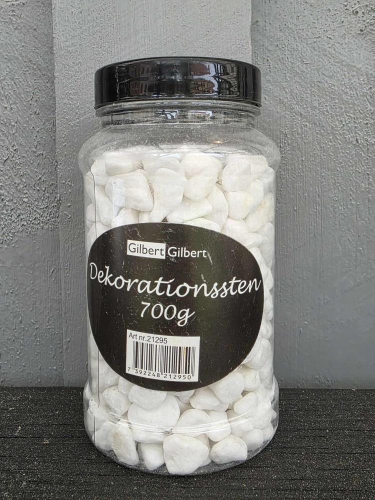 En burk med vit småsten, som dekoration i ljusstakar, ljusfat osv
