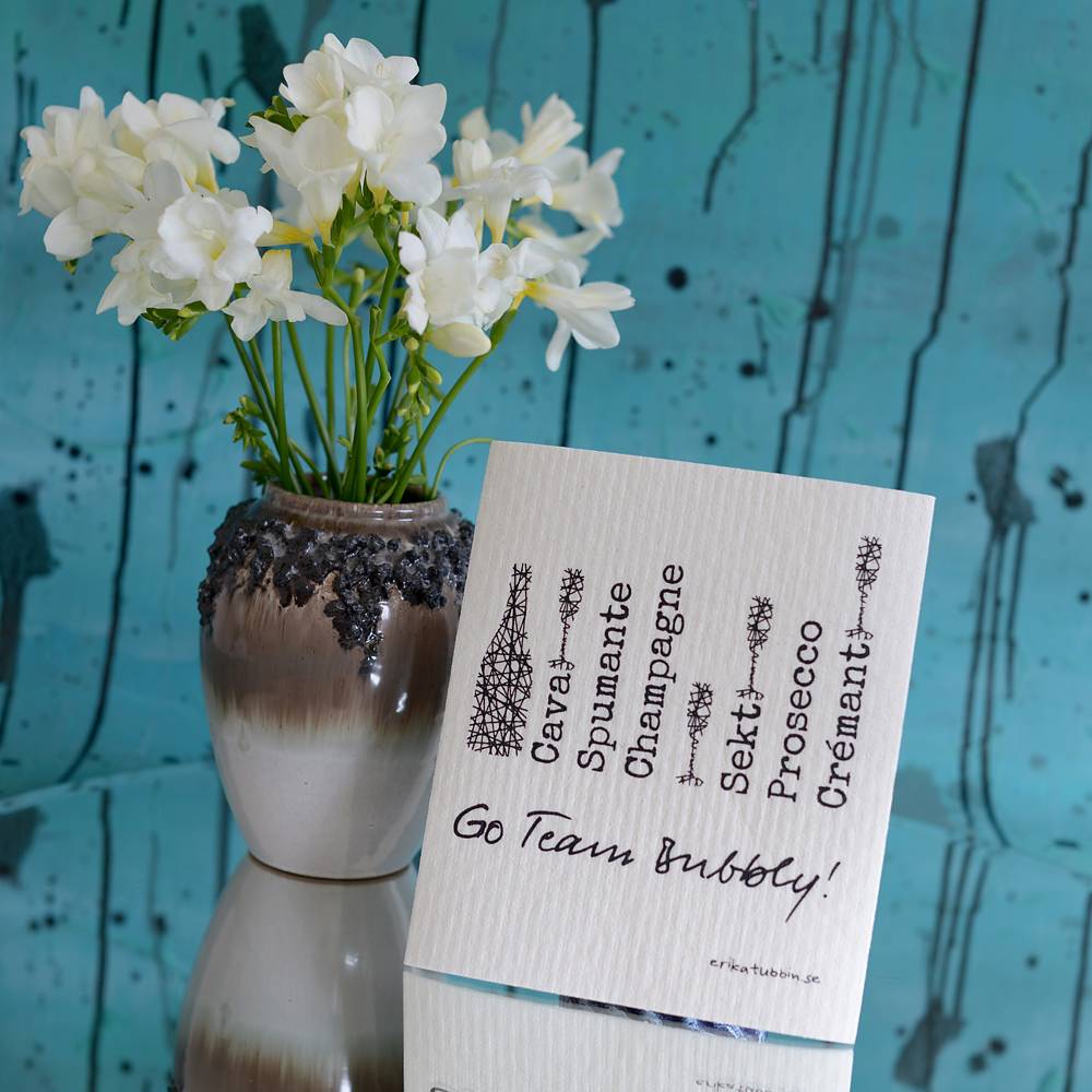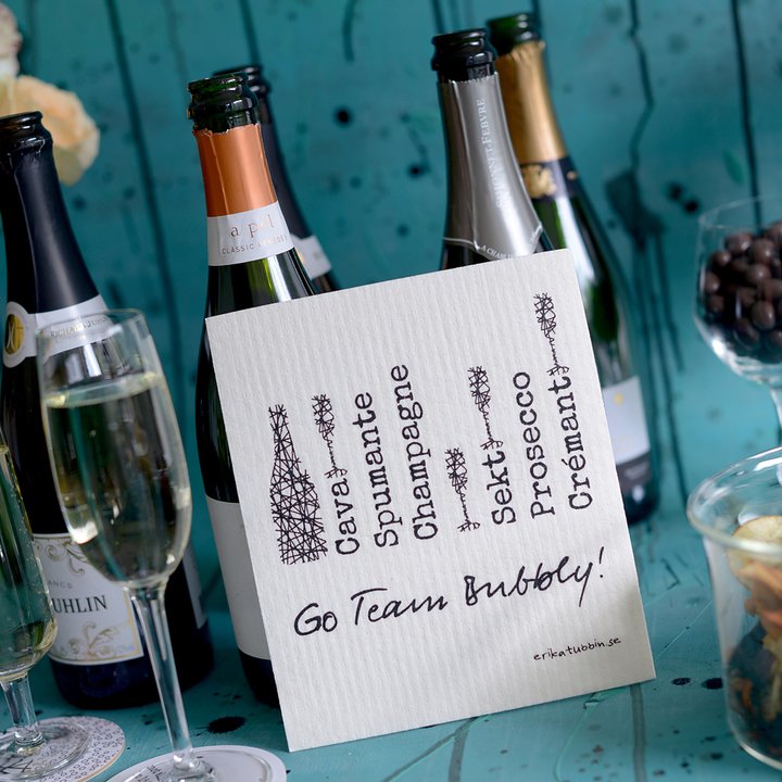 Festlig disktrasa/wettex, vit med svart tryck: "Go Team Bubbly"