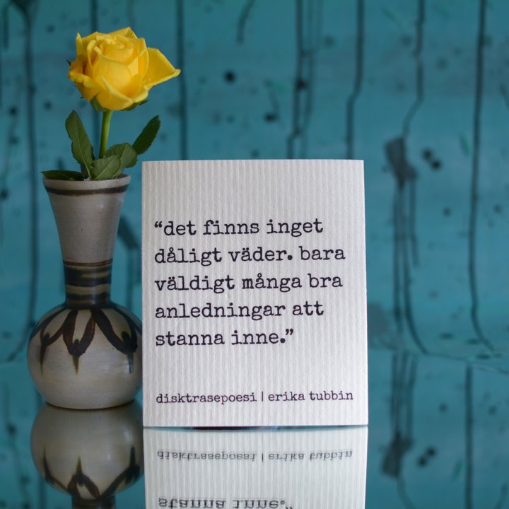 Festlig disktrasa/wettex, med tryck: "det finns inget dåligt väder. bara väldigt många bra anledningar att stanna inne."
