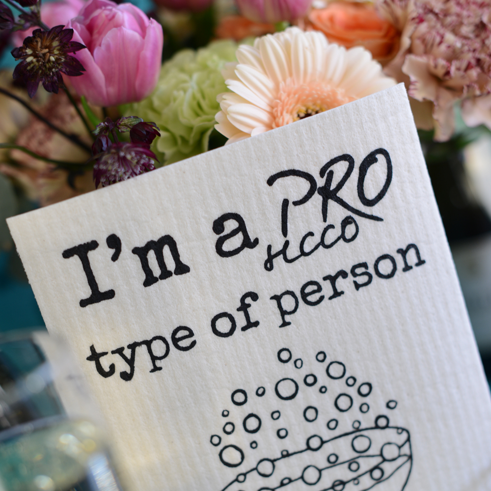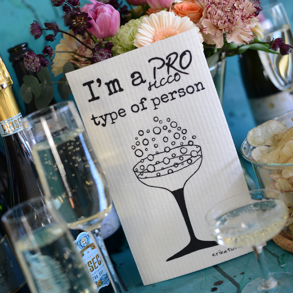 Benvit wettex med svart tryck och budskap; Text: "I'm a PROsecco type of person"