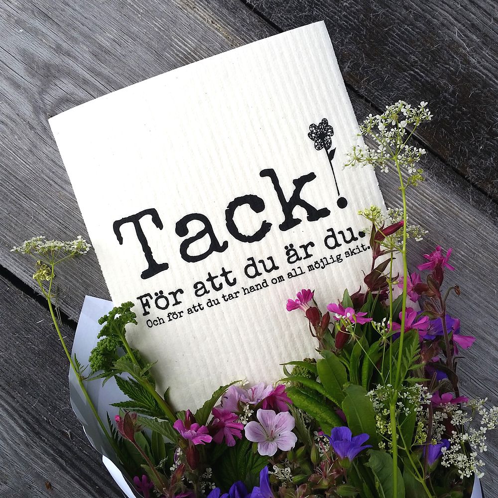 Benvit wettex trasa med svart tryck: "Tack för att du är du. och för att du tar hand om all möjlig skit"